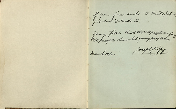 She first wrote in her scrapbook on the 10th March 1914, a few months before the beginning of the First World War. Possibly it was gifted it to her by Joseph Cliff who wrote in the book on the same day. A few months later, on the 4th of August, war was declared. The entry for the day after encourages Pearce to 'cheer up, be happy.'