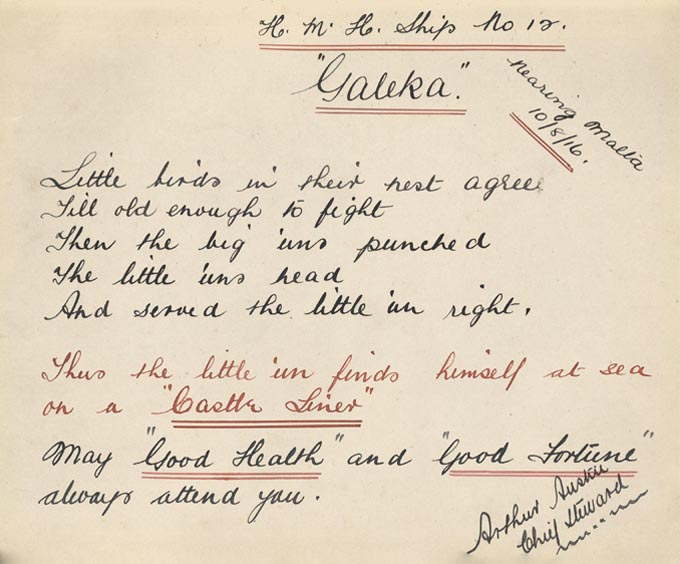 Entries in the scrapbook indicate that Pearce spent some time aboard the H.M.H.S. Galeka, a hospital ship. Through the entries we can trace the course of the ship. On the 10th of August 1916 they were nearing Malta, by the 13th they were on the Aegean Sea, and on the 14th they had reached Salonika. Whilst on board Pearce proved to be popular with the patients once again, with G. Steadman signing: